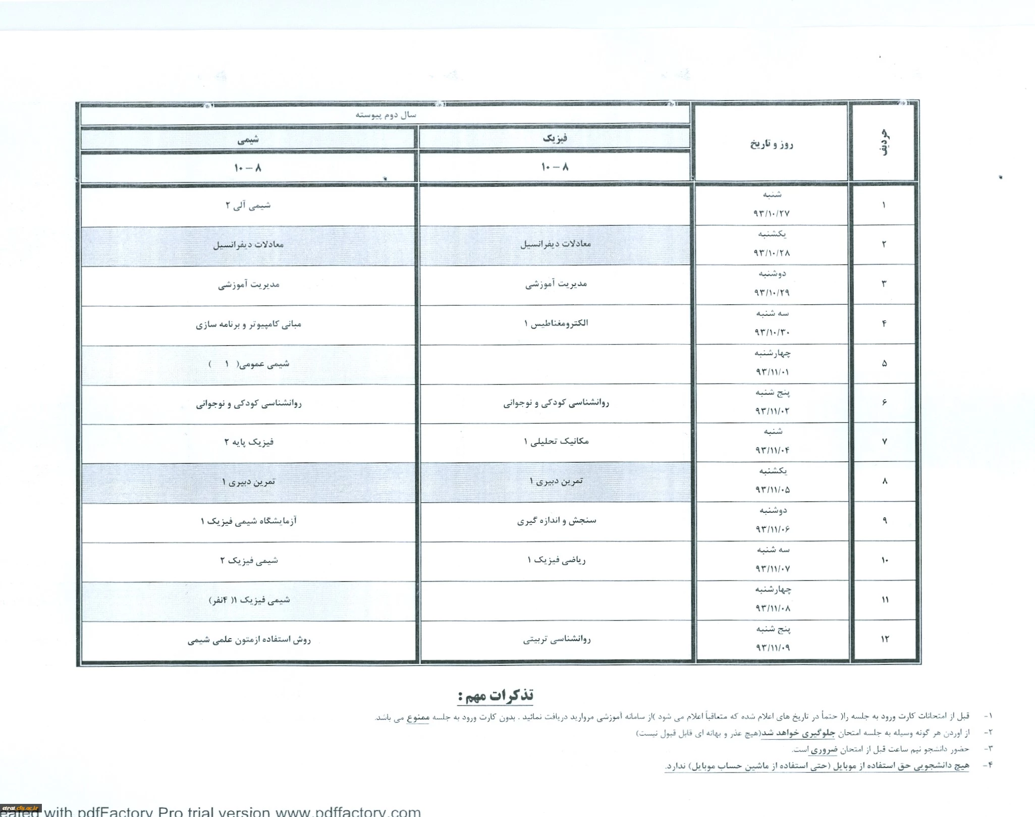 جدول زمانبندی امتحانات سال تحصیلی 1394-1393 نیمسال اول (پایان ترم) 2