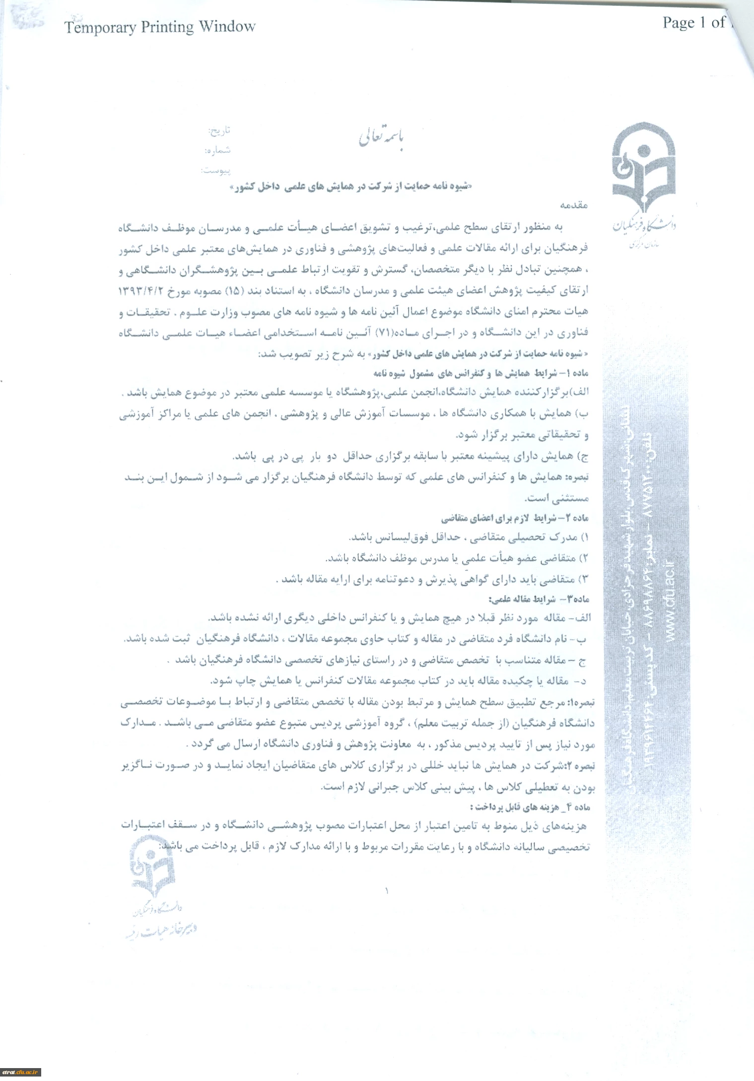 بخشنامه «شیوه نامه حمایت از شزکت مدرسان و اعضای هیئت علمی در همایش های علمی داخل کشور» 8
