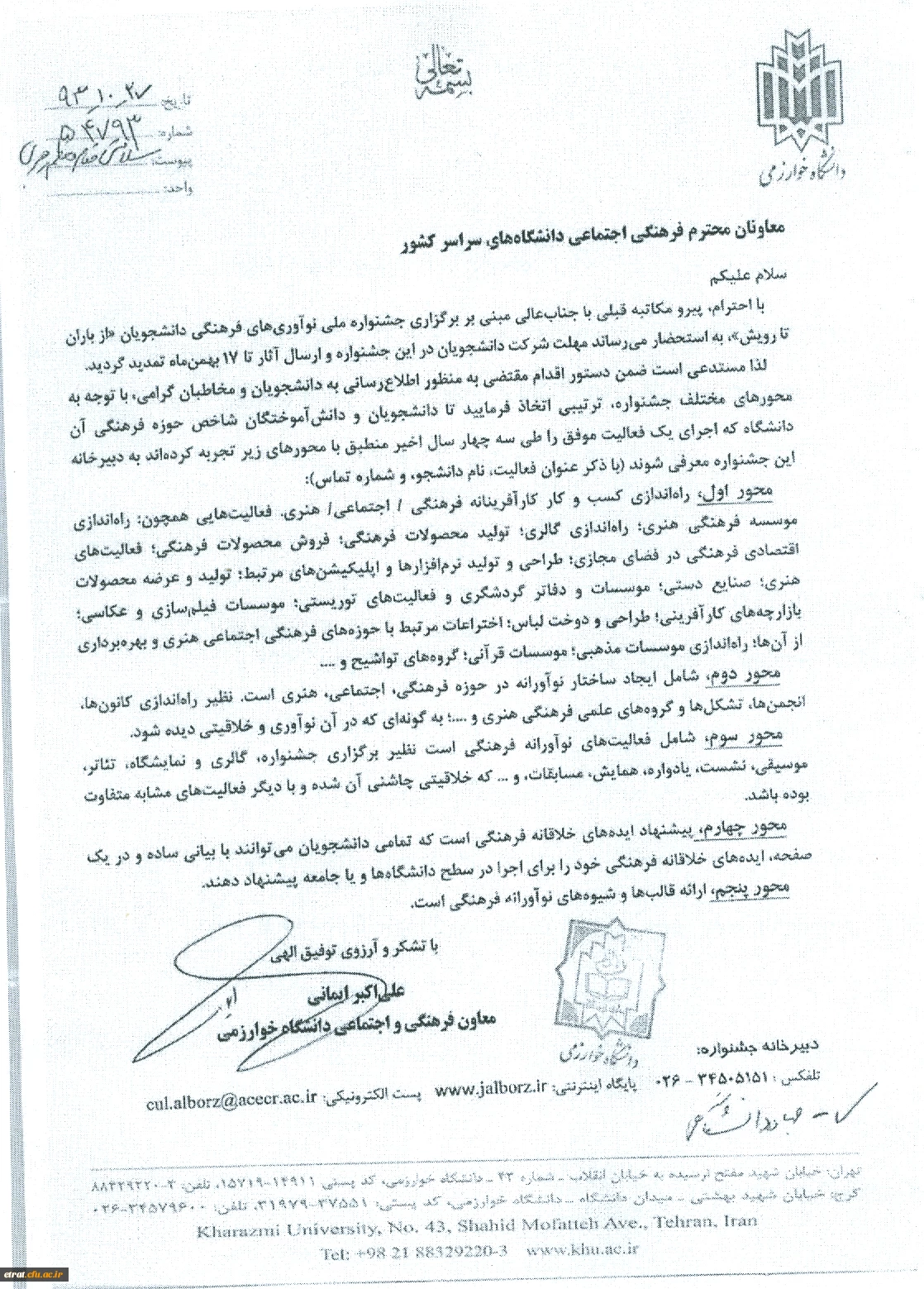 امتیاز دهید : مهلت شرکت دانشجویان و ارسال آثار درجشنواره «از باران تا رویش» تمدید گردید. 2 شنبه 11 بهمن 1393 ساعت 13:45